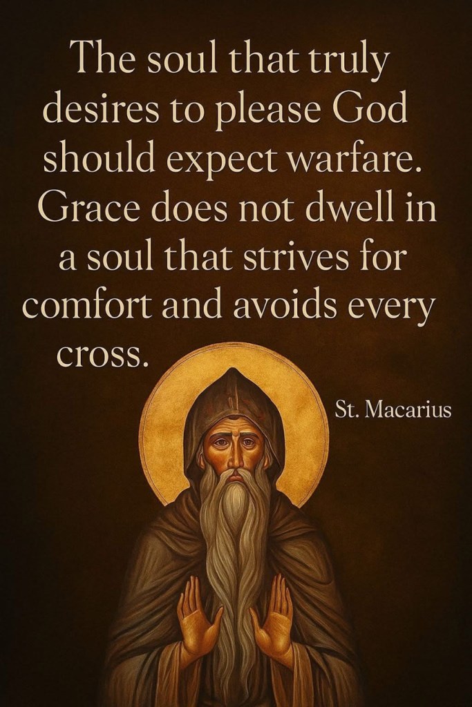 Deze uitspraak van St. Macarius is krachtig en confronterend. Hij herinnert ons eraan dat het christelijk leven geen pad van gemak is, maar van toewijding, strijd en overgave. In een wereld die comfort en gemak verheerlijkt, klinkt dit als een tegenstem — een oproep tot moedige spiritualiteit.