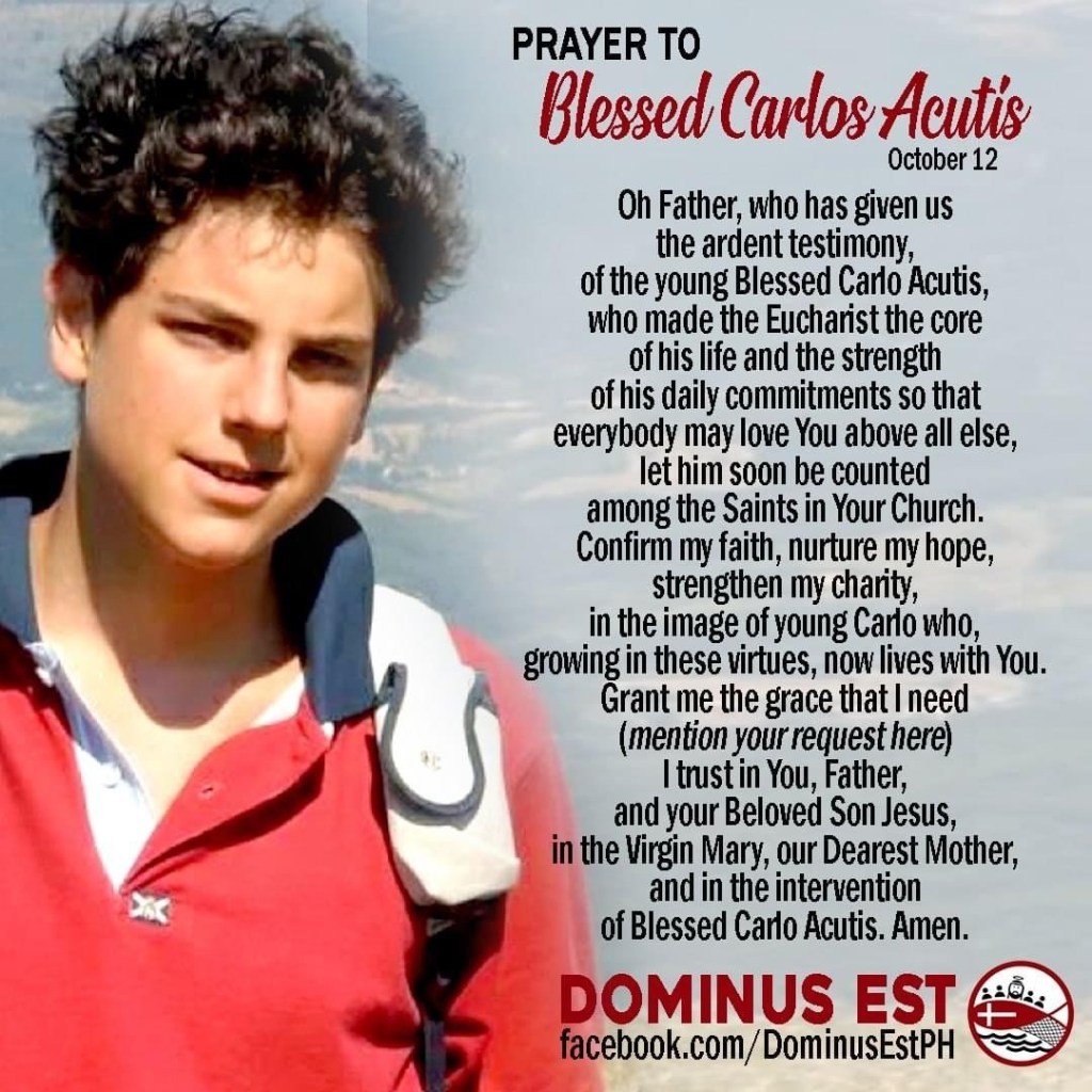 Goede God, U hebt Carlo Acutis aangeraakt met een vurige liefde voor Jezus in de Eucharistie. Laat ook mijn hart ontvlammen met datzelfde verlangen: om U te zoeken in stilte, U te dienen in eenvoud, en U te vertrouwen in alles. Help mij om, net als Carlo, de schoonheid van het geloof te ontdekken, de kracht van de sacramenten te omarmen, en mijn leven te richten op U alleen. Zegen mijn intentie die ik vandaag bij U breng (– noem hier uw gebed –) en laat mij groeien in geloof, hoop en liefde.