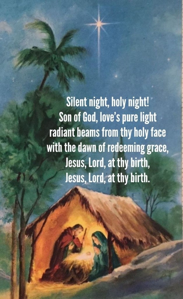 Stille nacht, heilige nacht! Zoon van God, liefde’s zuiver lichtstralen vloeien van uw heilig gelaat met de dageraad van verlossende genade, Jezus, Heer, bij uw geboorte,