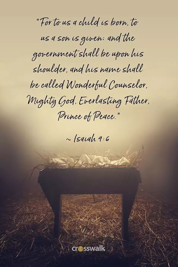 “Want een kind is ons geboren, een zoon is ons gegeven; de heerschappij rust op zijn schouders. Deze namen zal hij dragen: Wonderbare Raadsman, Sterke God, Eeuwige Vader, Vredevorst.”