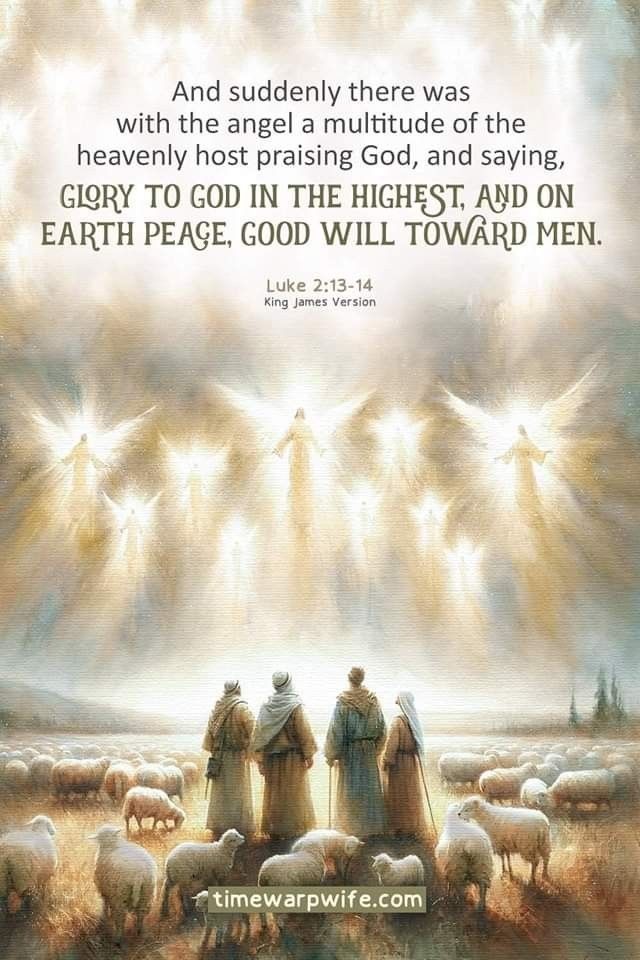 “En plotseling was er met de engel een menigte van de hemelse legermacht, die God loofde en zei:ERE ZIJ GOD IN DE HOOGSTE HEMELEN, EN VREDE OP AARDE, IN DE MENSEN EEN WELBEHAGEN.”