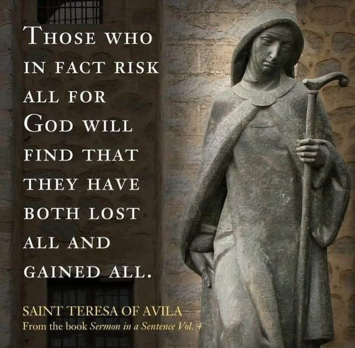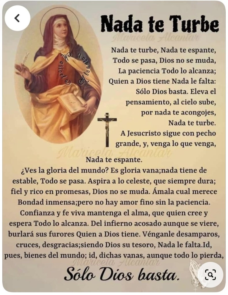 De herhaling van “Nada te turbe” – “Laat niets je verontrusten” – werkt als een mantra, een ademhaling van vertrouwen. Teresa’s geloof was niet naïef: ze kende lijden, ziekte, weerstand. Maar ze vond een onwrikbare vrede in het besef dat God genoeg is. Haar woorden zijn als een vesting voor de ziel, een plek waar stormen niet binnendringen.