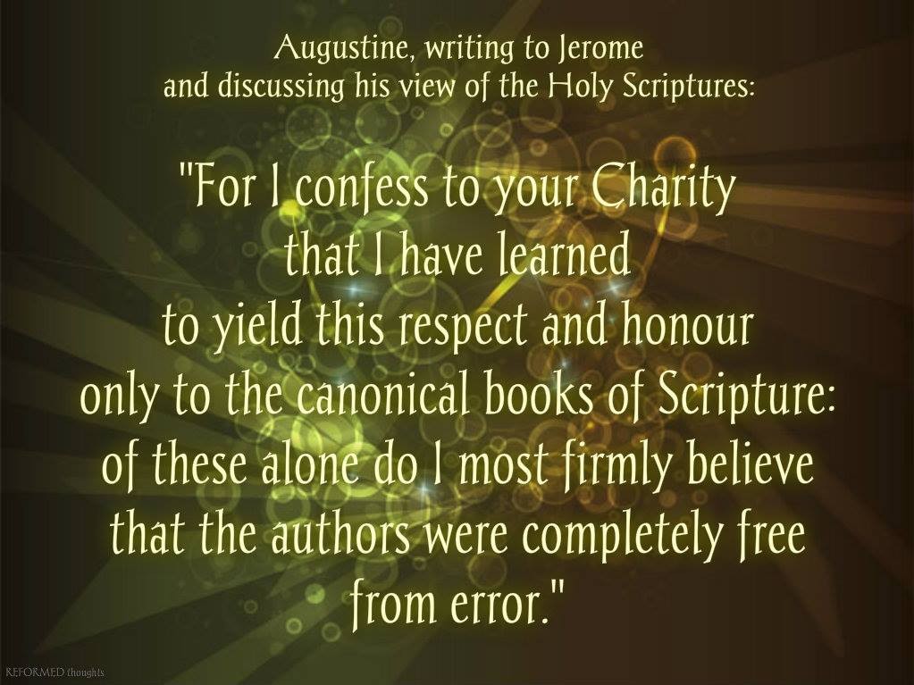 Want ik beken aan uw Liefde dat ik heb geleerd om dit respect en deze eer alleen te geven aan de canonieke boeken van de Schrift: van deze alleen geloof ik met vaste overtuiging dat de auteurs geheel vrij waren van dwaling. En als ik in deze geschriften iets tegenkom dat mij in verwarring brengt of dat mij strijdig lijkt met de waarheid, aarzel ik niet om te veronderstellen dat het manuscript gebrekkig is, of dat de vertaler de betekenis niet goed heeft begrepen, of dat ikzelf het niet goed heb begrepen.
