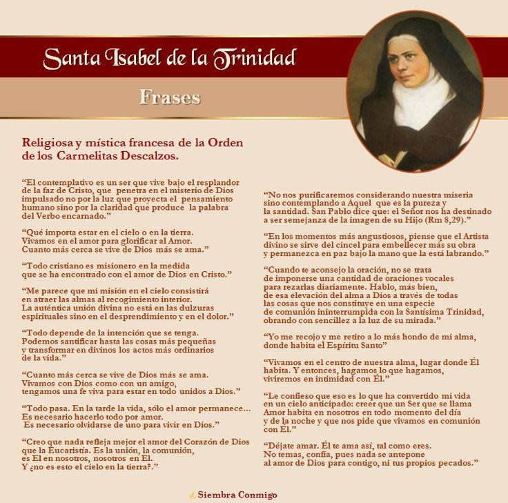 Elisabeth van de Heilige Drie-eenheid (1880–1906), karmelietes en mystica, leefde een leven van diepe innerlijke stilte en aanbidding. Haar spiritualiteit is geworteld in het besef dat God woont in het hart van de mens. Ze noemde zichzelf “Laudem Gloriae”—lof van Gods glorie—en verlangde ernaar dat haar hele wezen een tempel zou zijn waarin de Drie-eenheid werd verheerlijkt.