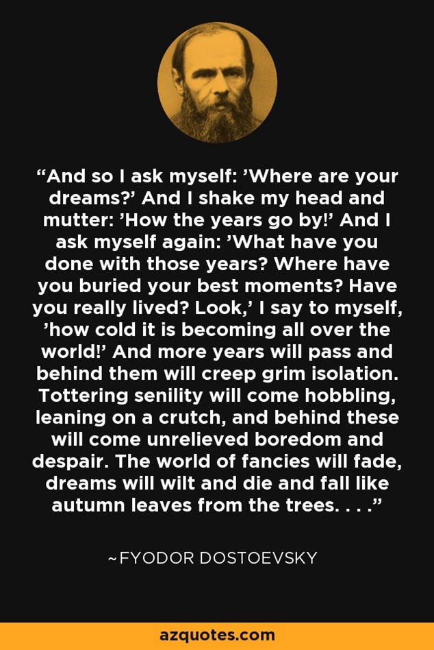 Dit fragment is een rauwe, eerlijke confrontatie met de vergankelijkheid van het leven. Dostoevsky stelt existentiële vragen die velen van ons herkennen: Waar zijn onze dromen gebleven? Hebben we werkelijk geleefd? Zijn we trouw geweest aan onze diepste verlangens?