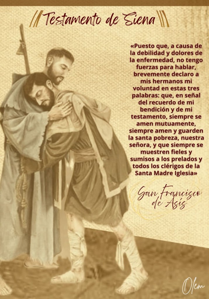 “Aangezien ik door zwakte en pijn van de ziekte niet meer de kracht heb om te spreken, verklaar ik mijn wil aan mijn broeders in deze drie woorden: dat zij, als herinnering aan mijn zegen en mijn testament, elkaar altijd liefhebben, altijd de heilige armoede, onze vrouwe, liefhebben en bewaren, en altijd trouw en nederig blijven tegenover de oversten en alle geestelijken van de Heilige Moeder Kerk.”