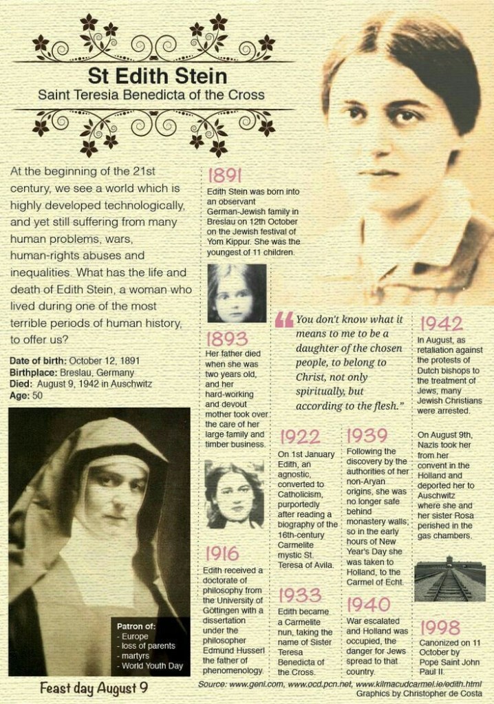 Joods van geboorte, omarmt ze het katholieke geloof terwijl ze al universiteitsprofessor en erkend filosofe is. Ze treedt toe tot de Ongeschoeide Karmelietessen en sterft als slachtoffer van de nazi’s in Auschwitz. Ze beschouwde haar bekering tot het katholieke geloof ook als een bekering tot een diepere identificatie met haar Joodse identiteit.