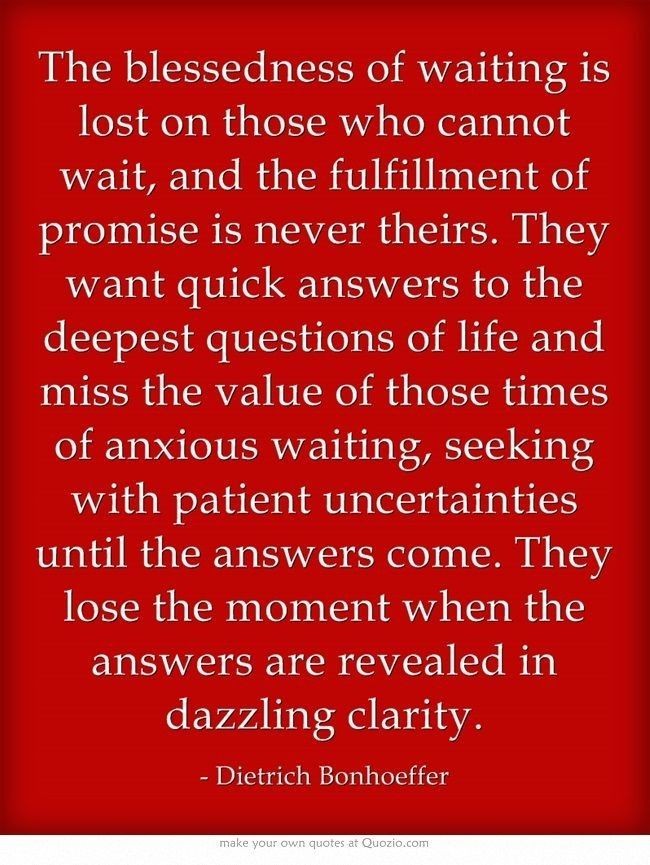 “De gezegende waarde van het wachten gaat verloren voor wie niet kan wachten, en de vervulling van de belofte is nooit voor hen. Zij willen snelle antwoorden op de diepste vragen van het leven en missen de waarde van die tijden van bezorgd wachten, zoekend met geduldige onzekerheid totdat de antwoorden komen. Zij missen het moment waarop de antwoorden worden onthuld in verblindende helderheid.”