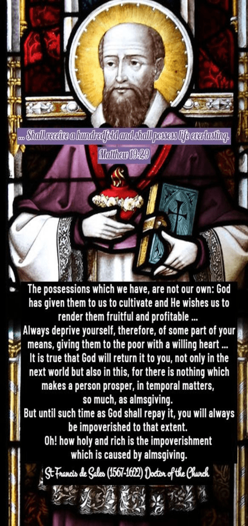 St. Franciscus van Sales nodigt ons uit om onze bezittingen niet als eigendom te beschouwen, maar als een opdracht van God. Zijn woorden zijn een krachtige herinnering dat echte rijkdom niet ligt in het vasthouden, maar in het delen. Hij noemt het “heilig en rijk” om arm te worden door het geven — een paradox die alleen in het licht van het evangelie zinvol is.
