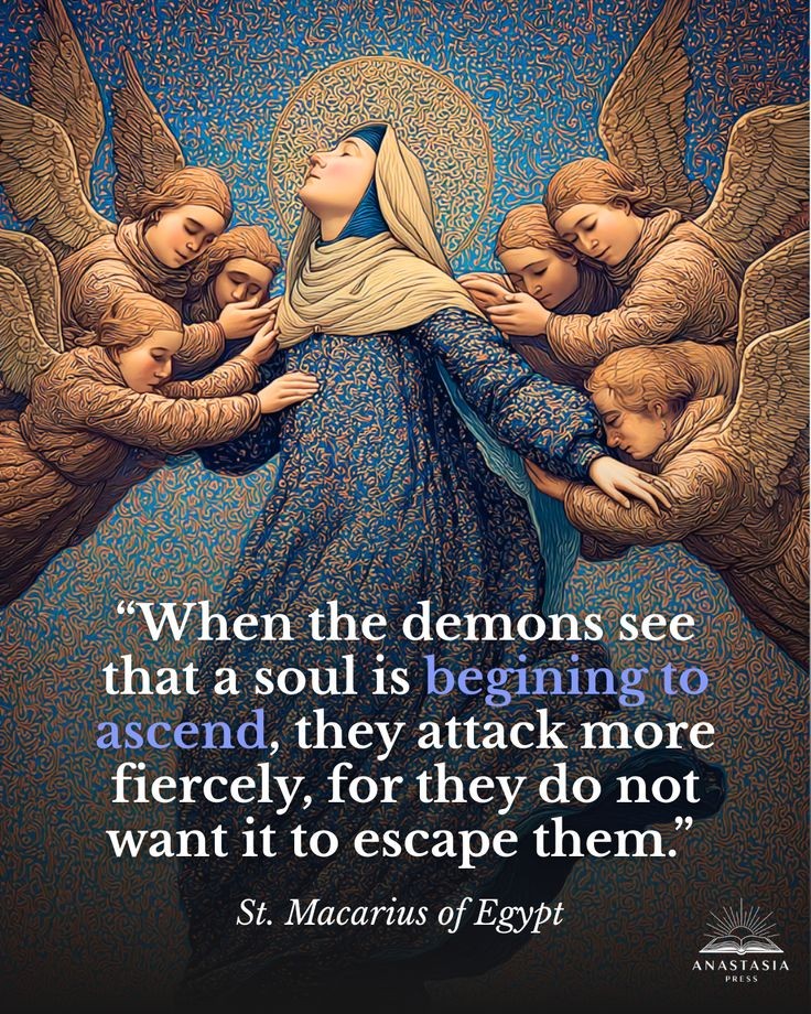 Deze uitspraak van de woestijnvader Macarius getuigt van diepe spirituele ervaring. Hij herinnert ons eraan dat geestelijke groei niet zonder strijd verloopt. Juist wanneer een ziel zich losmaakt van aardse begeerten en zich richt op God, wordt ze geconfronteerd met tegenstand — niet als straf, maar als bevestiging van haar vooruitgang. De demonen, symbolen van innerlijke en uiterlijke verleiding, proberen haar terug te trekken naar het duister. Maar hun woede is een teken van hun verlies: de ziel is onderweg naar het licht.