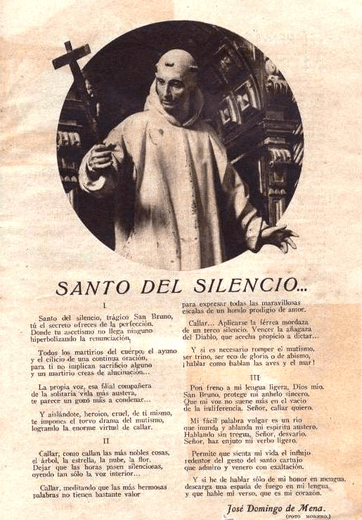 Stel een rem op mijn losse tong, o God. Sint Bruno, bescherm mijn oprechte verlangen. Laat mijn woorden niet meer wegstromen in de rivier van onverschilligheid. Heer, ik wil zwijgen. Mijn makkelijke woorden worden een stroom die mijn sobere geest verzacht en overspoelt. Spreken zonder rust, zonder ritme, zonder vuur— Heer, maak mijn woorden droog en licht. Laat mijn leven de invloed voelen van deze heilige betovering van afzondering, die ik bewonder en met vurigheid vereer. En als ik moet spreken zoals hij in zijn nederigheid, laat dan een vlammend zwaard mijn tong treffen, en laat mijn ziel spreken met zijn hart.