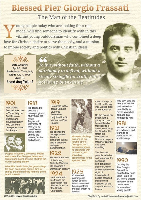 Jonge mensen die vandaag op zoek zijn naar een rolmodel, zullen in deze levendige jonge bergbeklimmer iemand vinden met wie ze zich kunnen identificeren: iemand die een diepe liefde voor Christus combineerde met een verlangen om de armen te dienen en een missie om de samenleving en de politiek te doordringen met christelijke idealen.
