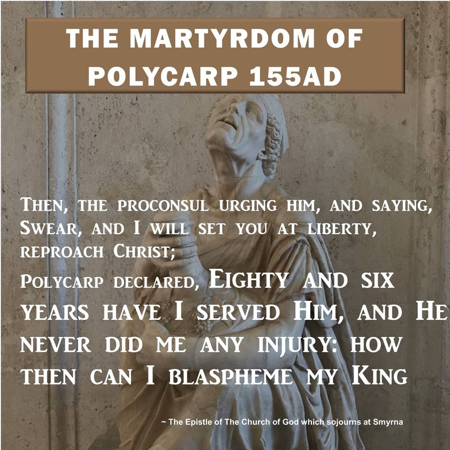 “De marteldood van Polycarpus – 155 na Christus. Toen de proconsul hem dringend vermaande en zei: ‘Zweer, en ik zal je vrijlaten; laster Christus,’ antwoordde Polycarpus: ‘Zesentachtig jaar dien ik Hem, en Hij heeft mij nooit enig kwaad gedaan. Hoe zou ik dan mijn Koning kunnen lasteren?’