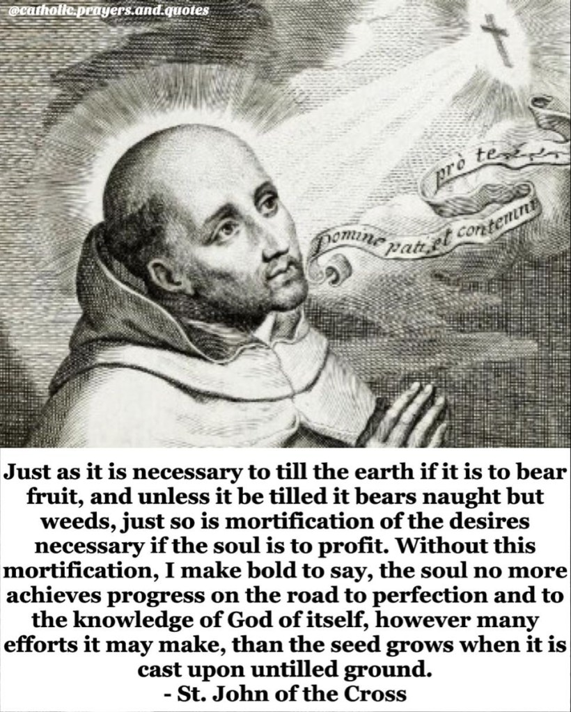 “Zoals het nodig is de aarde te bewerken als zij vrucht wil dragen — en als zij niet wordt bewerkt, brengt zij niets voort dan onkruid — zo is ook de versterving van de verlangens noodzakelijk als de ziel wil groeien. Zonder deze versterving, durf ik te zeggen, komt de ziel geen stap verder op de weg van de volmaaktheid en de kennis van God, hoezeer zij ook haar best doet; net zomin als een zaad ontkiemt wanneer het op onbewerkte grond wordt geworpen.”