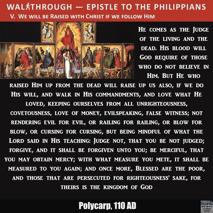 Hij komt als de Rechter van levenden en doden. Zijn bloed zal God eisen van hen die niet in Hem geloven. Maar Hij die Hem uit de dood heeft opgewekt, zal ook ons opwekken, als wij Zijn wil doen, wandelen in Zijn geboden, en liefhebben wat Hij liefhad. Dat betekent dat wij ons verre houden van alle ongerechtigheid, hebzucht, geldzucht, kwaadsprekerij en valse getuigenis; dat wij geen kwaad met kwaad vergelden, geen scheldwoord met scheldwoord, geen slag met slag, geen vloek met vloek. In plaats daarvan herinneren wij ons wat de Heer in Zijn onderricht heeft gezegd: “Oordeel niet, opdat u niet geoordeeld wordt; vergeef, en u zal vergeven worden; wees barmhartig, opdat u barmhartigheid zult ontvangen; met de maat waarmee u meet, zal u worden gemeten.” En opnieuw: “Zalig zijn de armen, en zij die vervolgd worden om de gerechtigheid, want hun is het Koninkrijk van God.”