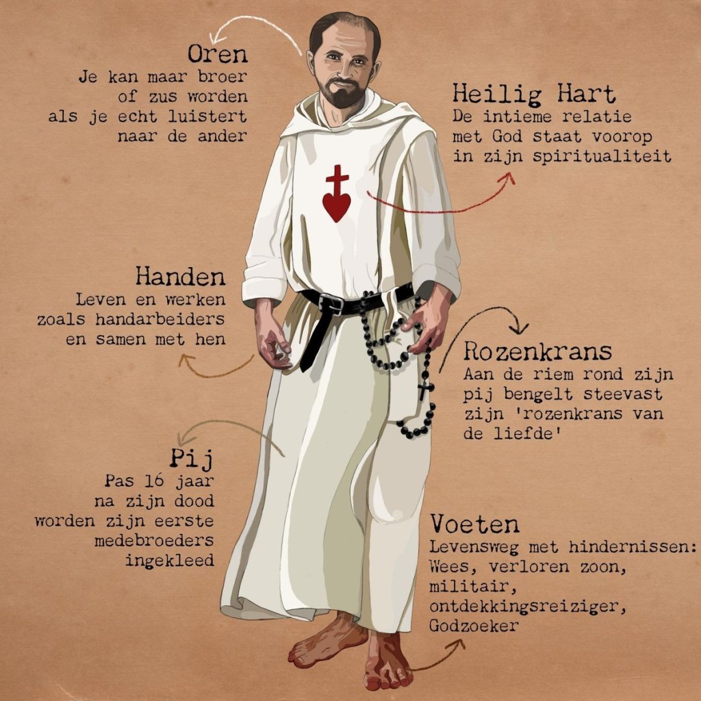 Rond zijn 30ste maakte hij een intense bekering door. Hij treedt in bij de trappisten, maar blijft zoeken naar zijn eigen weg. Na zijn priesterwijding richt hij een fraterniteit op in de Sahara. Enkele jaren later trekt hij nog dieper de woestijn in om het leven te delen van de Toearegs. Intussen nemen de spanningen met de Franse kolonisator toe. In 1916 wordt Charles daarvan het slachtoffer.