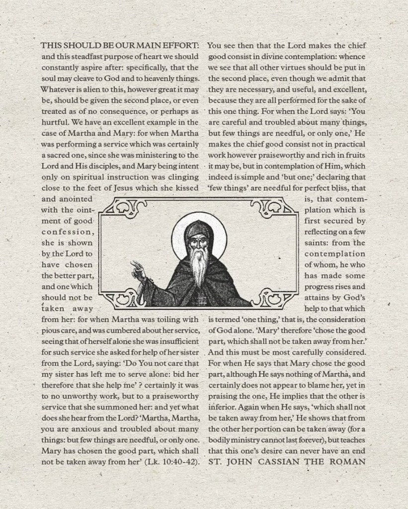 DIT MOET ONZE VOORNAAMSTE INSPANNING ZIJN: en dit standvastige voornemen van het hart moeten wij voortdurend nastreven: namelijk dat de ziel zich hecht aan God en aan de hemelse dingen. Alles wat hiervan afleidt, hoe groot het ook lijkt, moet op de tweede plaats komen, of zelfs als onbelangrijk worden beschouwd, of misschien zelfs als schadelijk. Wij hebben een uitstekend voorbeeld in het geval van Martha en Maria: want toen Martha een dienst verrichtte die zeker heilig was, aangezien zij de Heer en Zijn leerlingen bediende, en Maria, geheel gericht op geestelijke onderrichting, zich vastklampte aan de voeten van Jezus, die zij kuste en zalfde met de geur van goede belijdenis, toont de Heer aan dat zij het betere deel gekozen heeft, en dat dit haar niet zal worden ontnomen. Want toen Martha zich inspande met vrome zorg, en belast was met haar dienst, en zag dat zij alleen niet voldoende was voor zo’n taak, vroeg zij de Heer om hulp van haar zuster, zeggende: “Heer, bekommert U zich er niet om dat mijn zuster mij alleen laat dienen? Zeg haar dan dat zij mij helpt.” Zeker, zij riep haar niet tot een onwaardige taak, maar tot een prijzenswaardige dienst. En toch, wat hoort zij van de Heer? “Martha, Martha, je maakt je bezorgd en druk over vele dingen; maar weinig is nodig, of slechts één. Maria heeft het goede deel gekozen, dat haar niet zal worden ontnomen” (Lc. 10, 40–42).