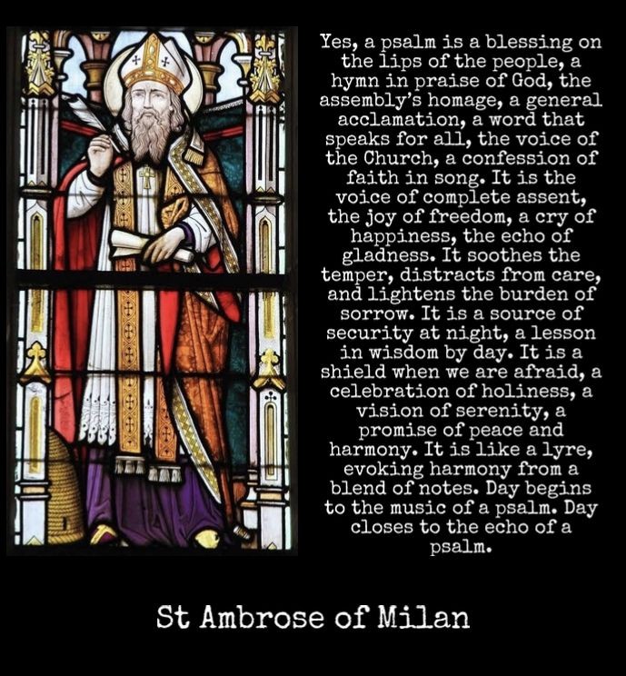 “Ja, een psalm is een zegen op de lippen van het volk, een hymne ter ere van God, de hulde van de gemeenschap, een algemene acclamatie, een woord dat spreekt namens allen, de stem van de Kerk, een geloofsbelijdenis in gezongen vorm. Het is de stem van volledige instemming, de vreugde van vrijheid, een kreet van geluk, de weerklank van blijdschap. Het verzacht het temperament, leidt af van zorgen en verlicht de last van verdriet. Het is een bron van veiligheid in de nacht, een les in wijsheid overdag. Het is een schild wanneer we bang zijn, een viering van heiligheid, een visioen van sereniteit, een belofte van vrede en harmonie. Het is als een lier die harmonie oproept uit een mengeling van tonen. De dag begint met de muziek van een psalm. De dag sluit met de echo van een psalm.”