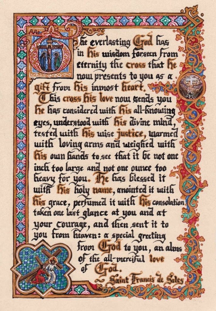 De eeuwige God heeft in zijn wijsheid van eeuwigheid af het kruis voorzien dat Hij u nu aanbiedt als een gave uit zijn diepste hart.Dit kruis, dat zijn liefde u nu zendt, heeft Hij met zijn alwetende ogen aanschouwd, met zijn goddelijke geest doorgrond, met zijn wijze gerechtigheid beproefd, met liefdevolle armen verwarmd en met zijn eigen handen gewogen om zeker te zijn dat het geen duim te groot en geen ons te zwaar voor u zou zijn. Hij heeft het gezegend met zijn heilige naam, gezalfd met zijn genade, geparfumeerd met zijn vertroosting, u en uw moed nog één laatste blik toegeworpen, en het toen vanuit de hemel tot u gezonden: een bijzondere groet van God aan u, een aalmoes van Gods alles-ontfermende liefde.
