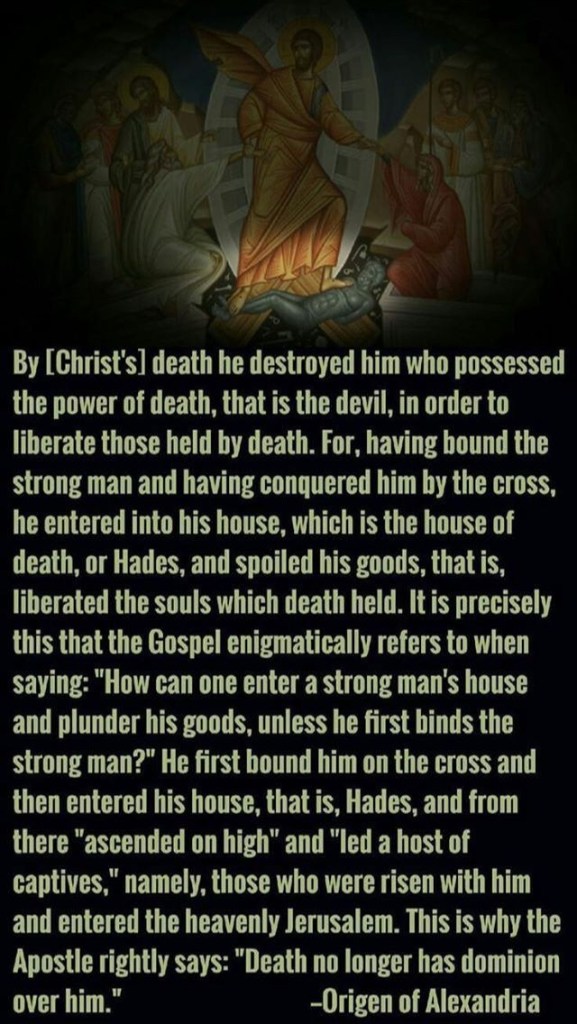 Origenes opent hier een van de oudste en meest krachtige christelijke beelden: de Harrowing of Hell, de nederdaling van Christus in het dodenrijk. Hij leest de kruisdood niet als nederlaag, maar als de beslissende slag in een kosmisch drama.