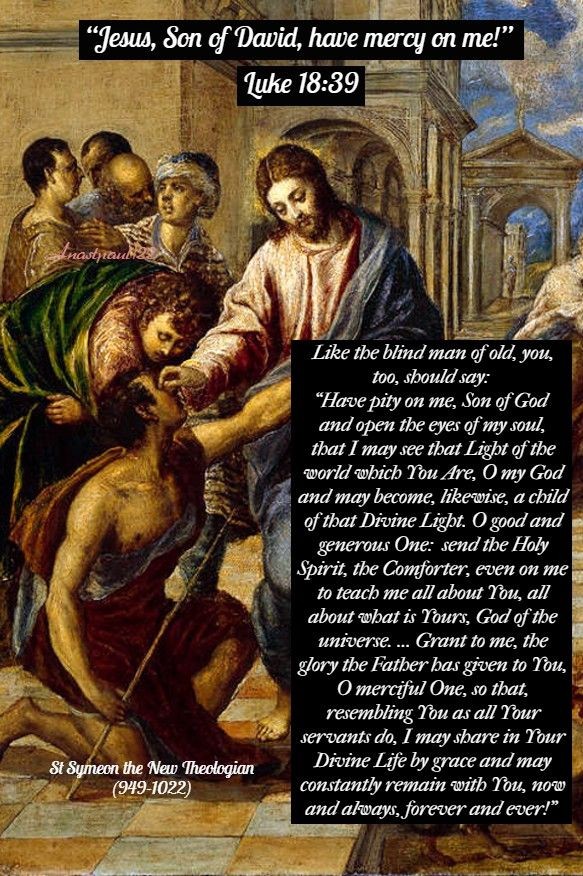 Symeon de Nieuwe Theoloog laat zien dat deze roep niet alleen een historische gebeurtenis is, maar een innerlijke weg. Blindheid is bij hem niet lichamelijk, maar geestelijk: het onvermogen om het goddelijk Licht te zien dat altijd al aanwezig is. Zijn gebed is een radicale overgave: hij vraagt niet om een klein beetje hulp, maar om deel te krijgen aan Gods eigen leven.