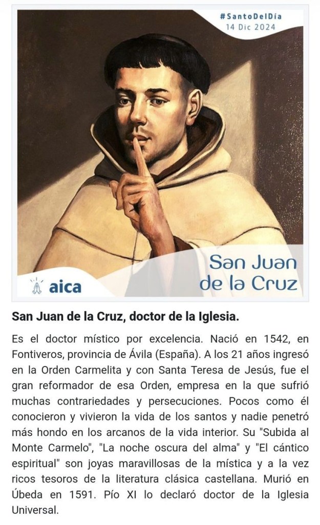 Hij is bij uitstek de mystieke leraar. Hij werd geboren in 1542 in Fontiveros, in de provincie Ávila (Spanje). Op 21‑jarige leeftijd trad hij in bij de Karmelietenorde en werd, samen met de heilige Teresa van Jezus, de grote hervormer van die orde—een onderneming waarin hij vele tegenwerkingen en vervolgingen moest doorstaan. Weinigen kenden en leefden zo diep de weg van de heiligen als hij, en niemand drong zo ver door in de geheimen van het innerlijke leven. Zijn Bestijging van de Berg Karmel, De donkere nacht van de ziel en Het geestelijk lied zijn wonderlijke juwelen van de mystiek en tegelijk rijke schatten van de klassieke Castiliaanse literatuur. Hij stierf in Úbeda in 1591. Paus Pius XI verklaarde hem tot kerkleraar van de universele Kerk.