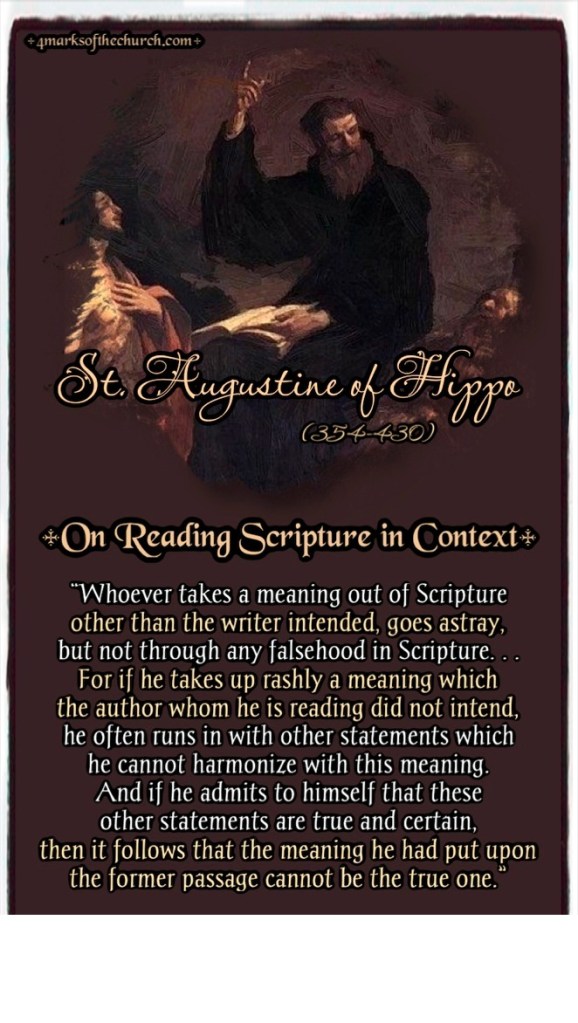 “Wie een betekenis uit de Schrift haalt die de schrijver niet bedoelde, dwaalt af — maar niet door een fout in de Schrift zelf. Want als hij onbezonnen een betekenis aanneemt die de auteur niet heeft bedoeld, stuit hij vaak op andere uitspraken die hij niet met die betekenis kan verzoenen. En als hij erkent dat die andere uitspraken waar en zeker zijn, dan volgt daaruit dat de betekenis die hij aan het eerdere gedeelte gaf, niet de ware kan zijn.”