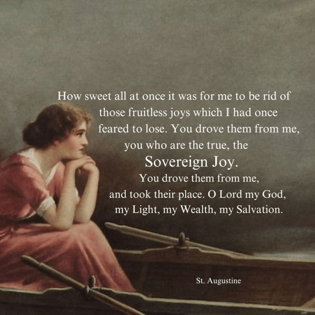 “Hoe zoet was het ineens voor mij om verlost te zijn van die vruchteloze genoegens, waarvan ik ooit vreesde ze te verliezen. U hebt ze van mij verdreven, U, die de ware, de Soevereine Vreugde bent.