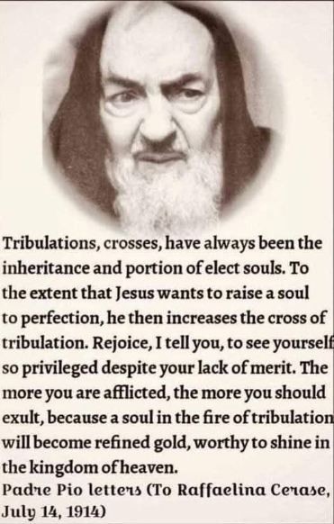 “Beproevingen, kruisen, zijn altijd het erfdeel en de roeping van uitverkoren zielen geweest. Naarmate Jezus een ziel tot volmaaktheid wil verheffen, vermeerdert Hij het kruis van beproeving. Verheug je, zeg ik je, dat je zo bevoorrecht bent ondanks je gebrek aan verdienste. Hoe meer je gekweld wordt, des te meer moet je juichen, want een ziel in het vuur van beproeving wordt zuiver goud, waardig om te schitteren in het koninkrijk der hemelen.”