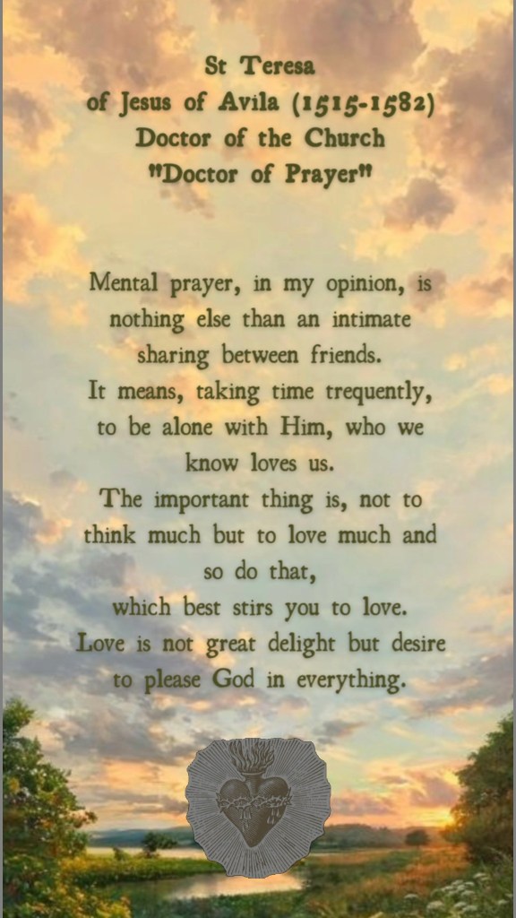 St. Teresa’s woorden zijn een uitnodiging tot eenvoud en diepgang. Ze herinnert ons eraan dat gebed geen intellectuele prestatie is, maar een liefdesrelatie. Haar nadruk op “intieme omgang tussen vrienden” maakt van gebed iets vertrouwds, iets dat ieder mens kan beoefenen, ongeacht kennis of status.